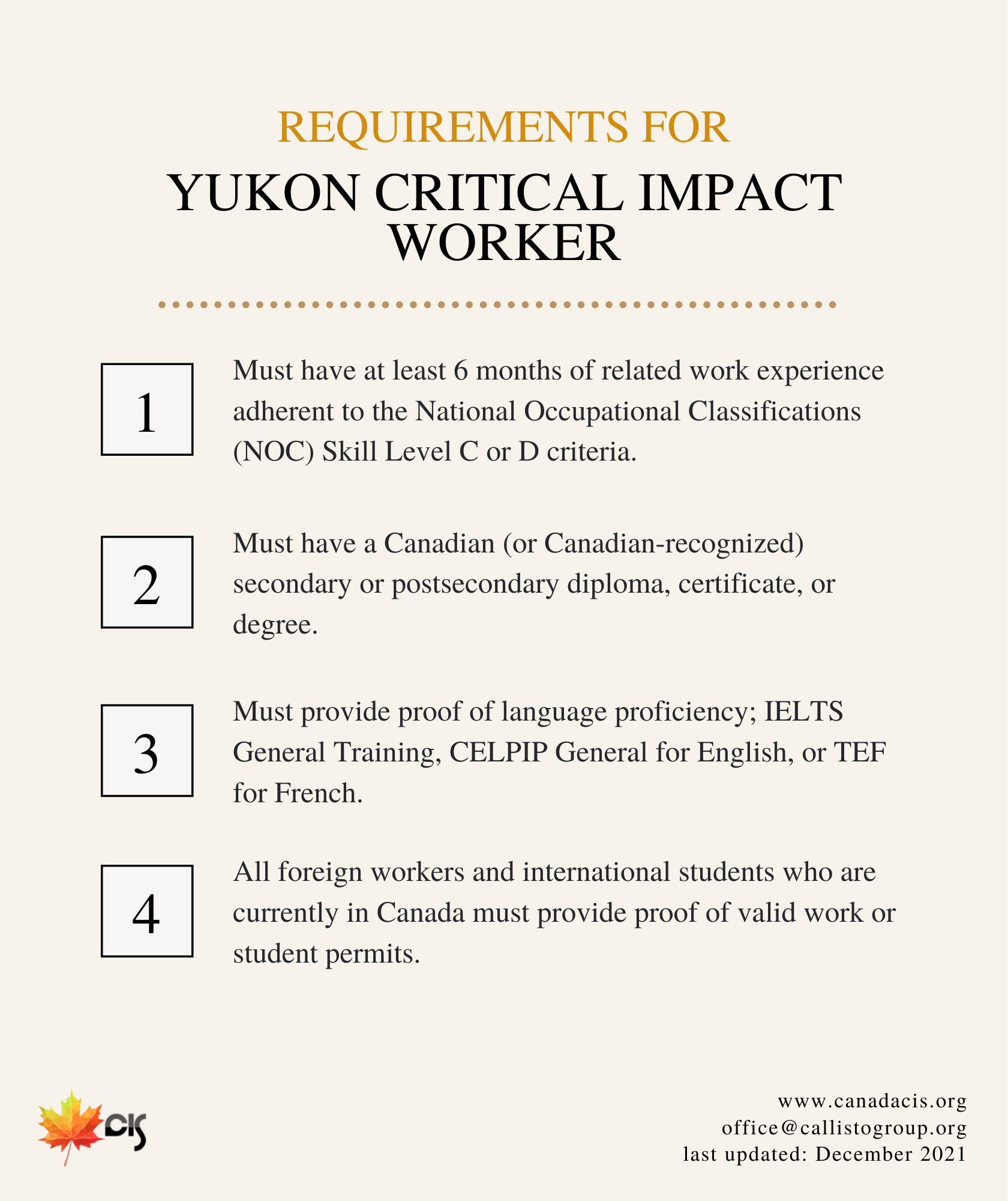 Employers may nominate workers with experience in low- or semi-skilled jobs for permanent residence in Canada under the Yukon Nominee Program (YNP) Critical Impact Worker stream.